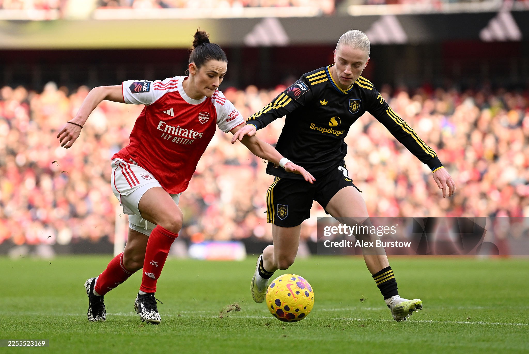 In the midwinter North London chill, fans inside the Emirates were not alone in struggling to warm up. It was the visitors from the North of England that were the first side to test either goalkeeper. With Jess Park probing and operating in the spaces usually filled by Ella Toone. Manchester United duo, Park and Anna Sandberg combined with a one-two into the Arsenal box. The chipped cross was sublime from Park and it was met by the head of Rolfö. That forced Borbe into an excellent instinctive stop tipping the ball onto the crossbar before the Gunners defence scrambled to clear it.