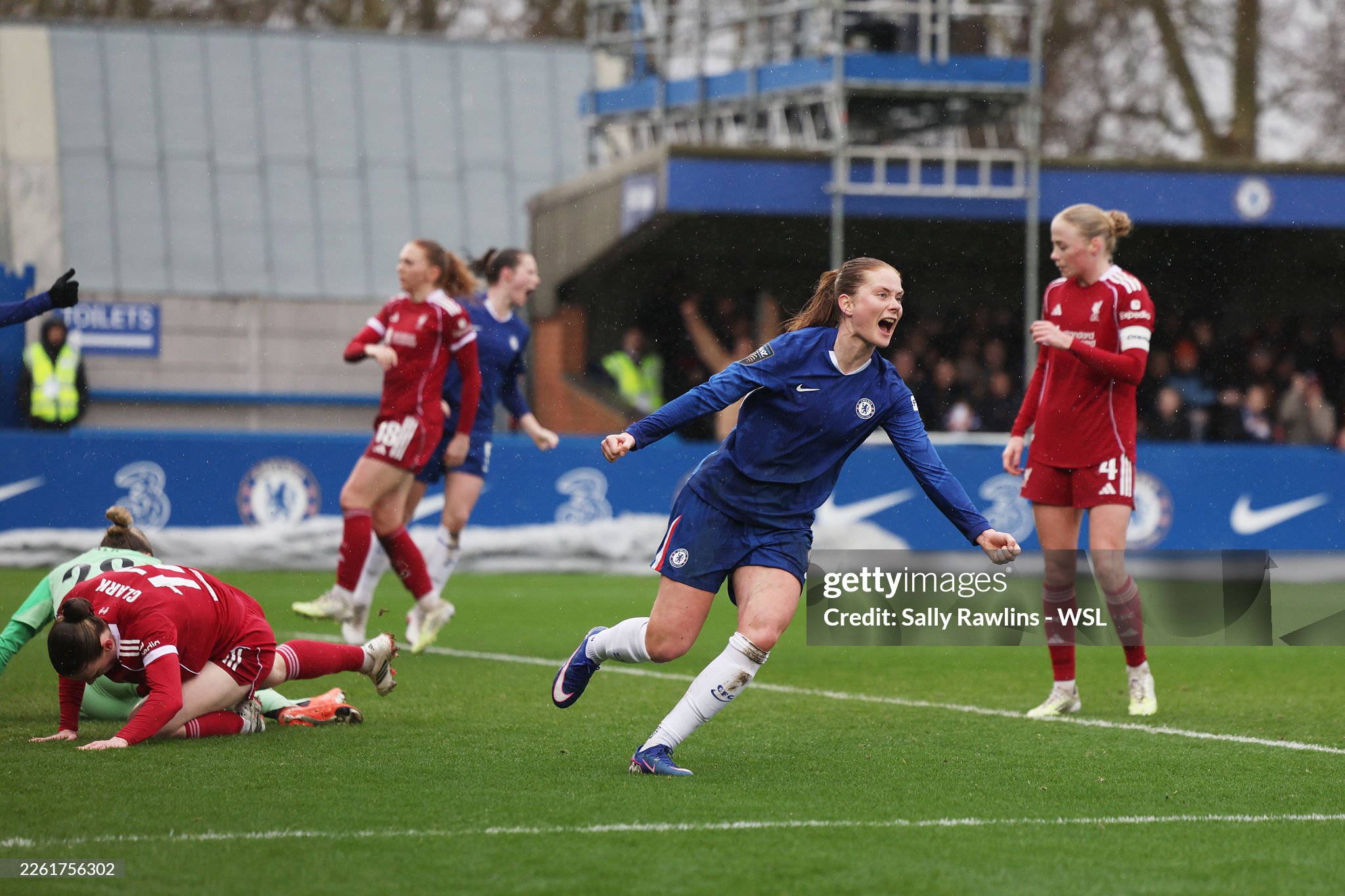 On a rainy afternoon in West London it was Liverpool who had the ball in the back of the net first. Alice Bergstrom started the move with an excellent cross field ball which found former Blue Alejandra Bernabé whose wicked cross just evaded Martha Thomas but found Bergstrom lurking at the back post. Bergstrom controlled the ball against her hand before she finished past Hannah Hampton excellently but the referee blew for a handball. And the scores remained level.